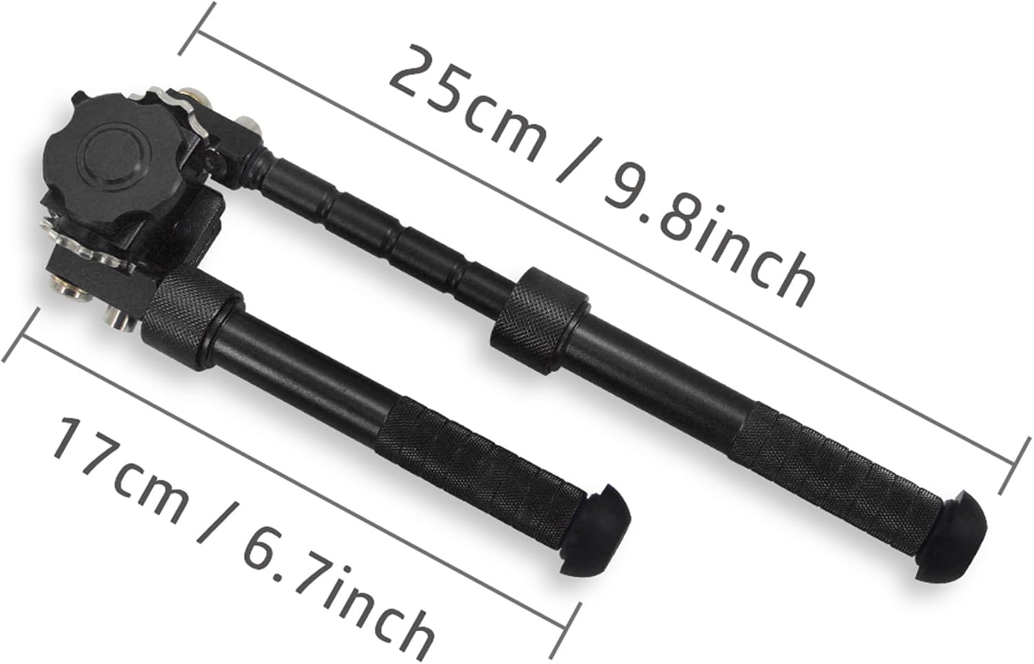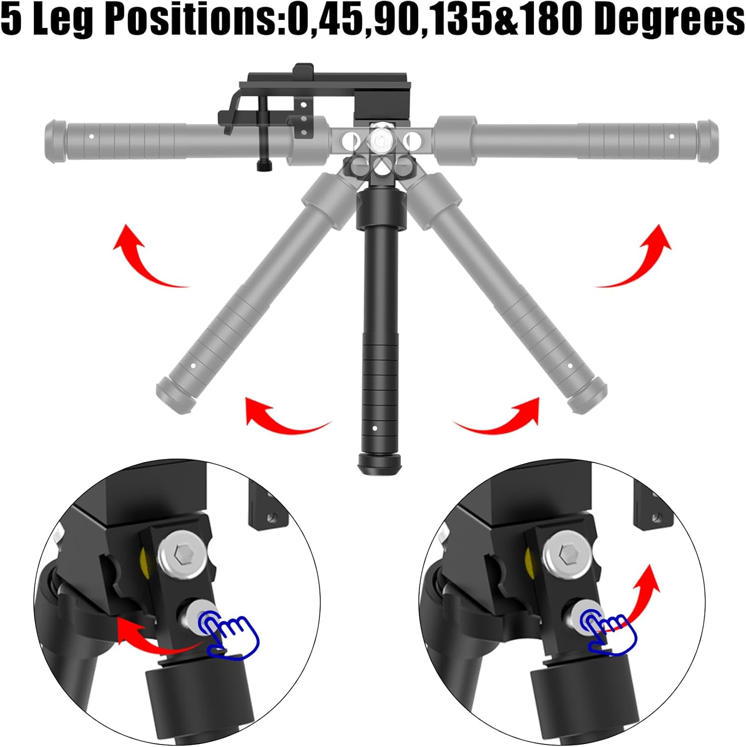 [Easy adjustments]: Each leg has 5 positions: 0, 45, 90, 135 and 180 degrees. 5 locking detents for different leg lengths, the central height of the bipod can be adjusted from 6 inches to 9 inches, providing varied bipod positioning to fit different terrain heights.